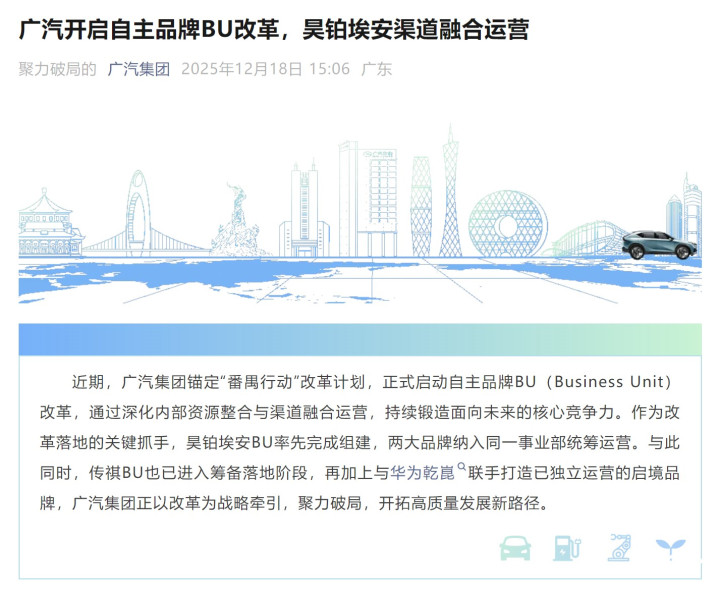 近日,广汽集团宣布启动自主品牌BU改革。这其中,昊铂埃安BU完成组建,两大品牌纳入同一事业部统筹运营。