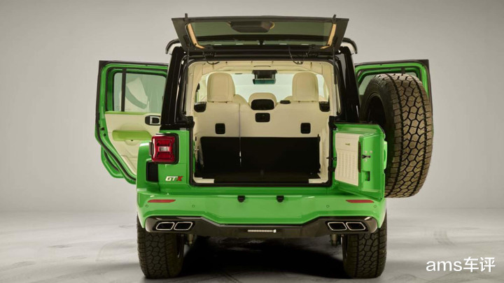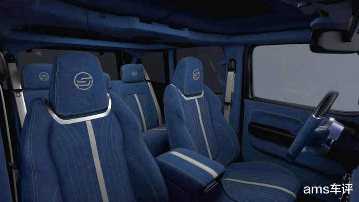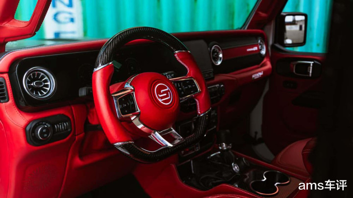 新车内饰则彻底告别工具车属性,氛围相比原厂牧马人明显精致得多,采用了Nappa真皮+Alcantara翻毛皮+碳纤维装饰件组合,座椅部分配有醒目的绗缝图案,整体触感与视觉效果都更高级、更现代。并针对信息娱乐系统、音响系统以及驾驶辅助系统进行深度定制与强化。同时,新车的官图也暗示,无论是内饰还是外观,都可以根据客户个人喜好进行高度个性化定制。
